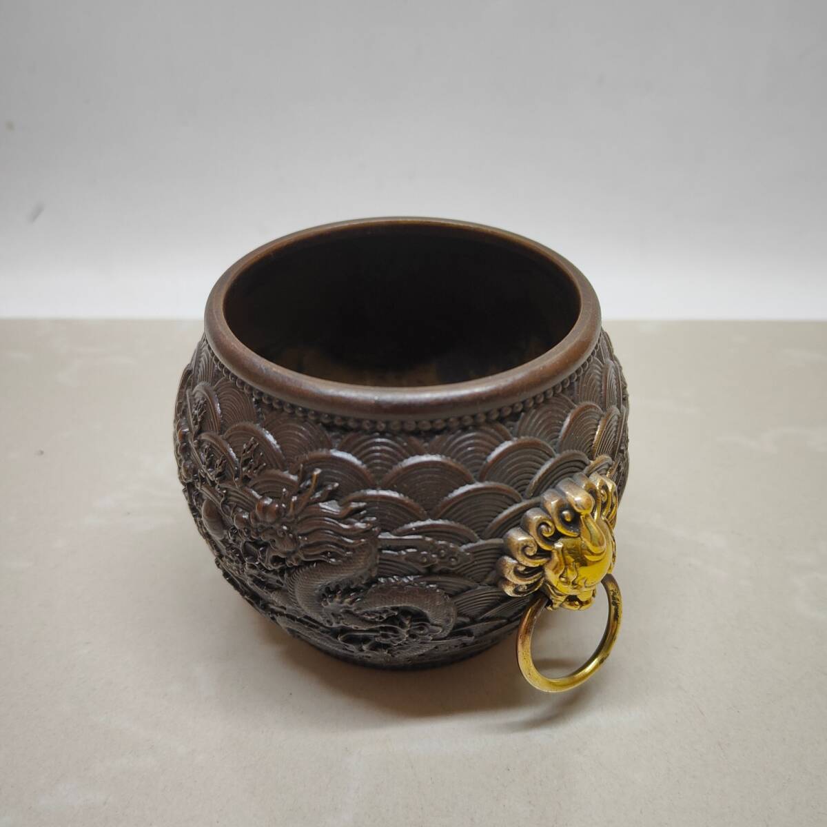 - 【超珍館蔵】黄銅製 塗金 虎頭缸 置物 賞物 古賞物 古董品 古美術品 時代物 旧家蔵出 稀少珍蔵品
