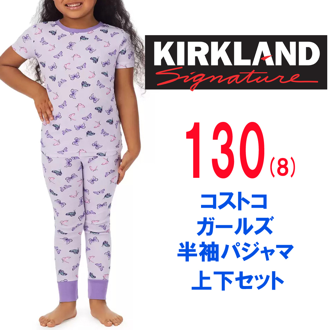 - 新品 上下 セット 130 ★ コストコ カークランドシグネチャー ガールズ 半袖 パジャマ Tシャツ ロングパンツ 8 パープル ちょうちょ 綿