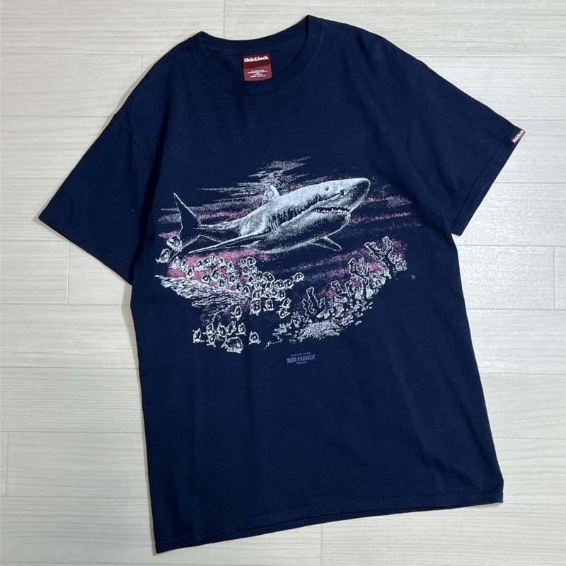 - HIDE AND SEEK/ハイドアンドシーク/SHARK S/S Tee/シャーク半袖Tシャツ/グラフィックプリントTシャツ/ネイビー/Mサイズ