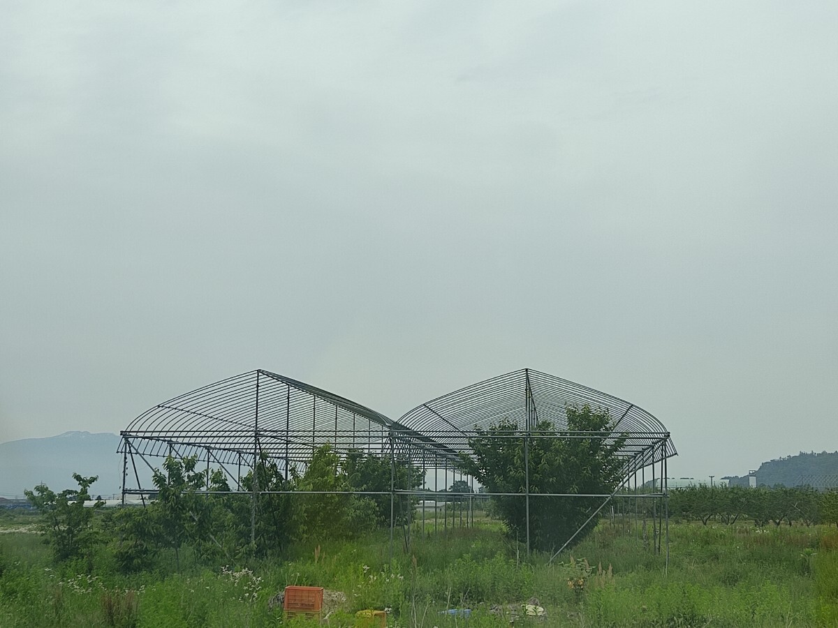 - 引取限定 サクランボ 雨避けハウス 2連棟 盆明けのお引渡し Φ22アーチ 骨組みΦ48.3 筋交いΦ42.7 峰Φ42.7 どぶ&鉄クランプ混合