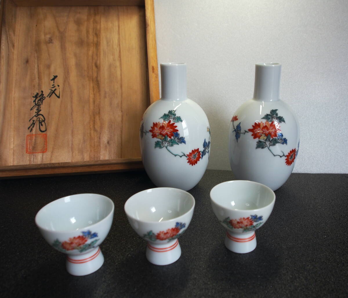 > 期間限定価格!十二代柿右衛門・錦牡丹・酒器揃い(徳利2+おちょこ3、未使用&長期保管品)