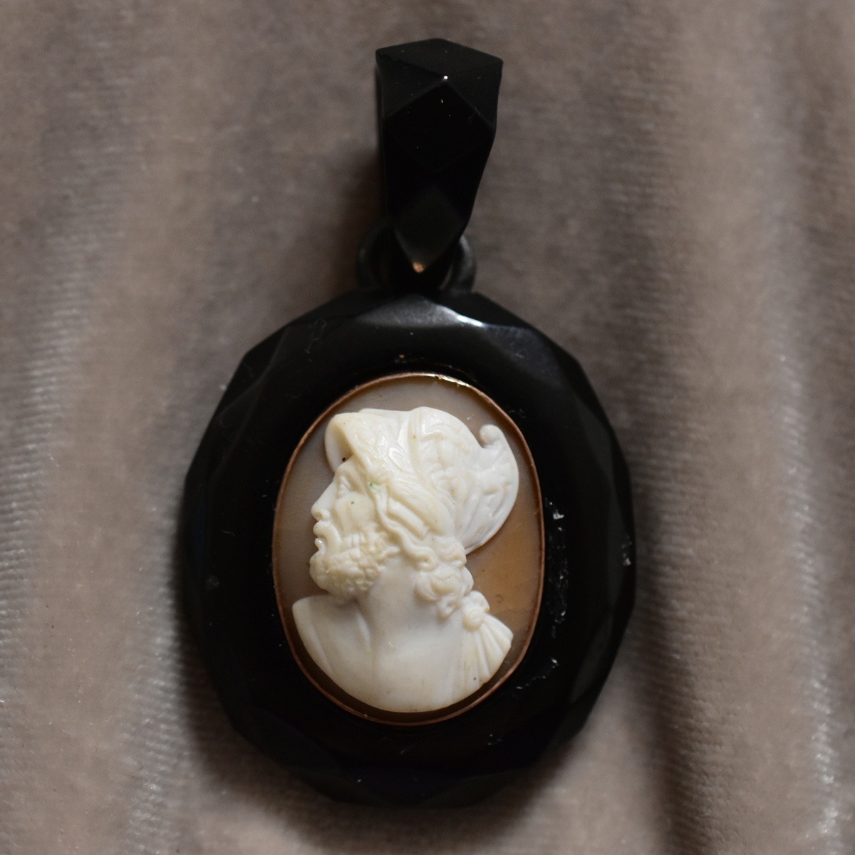 > 2way アンティーク 全能の神ゼウスのシェルカメオとエナメルミニアチュールのジェットフレームのペンダントトップ/チャーム 本物保証