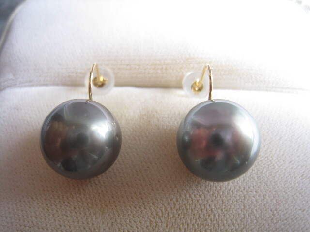 - [SAMU]極美!!照り抜群大玉天然南洋黒蝶真珠12.5mmX2粒 k18金イエローゴールドピアス 新品!