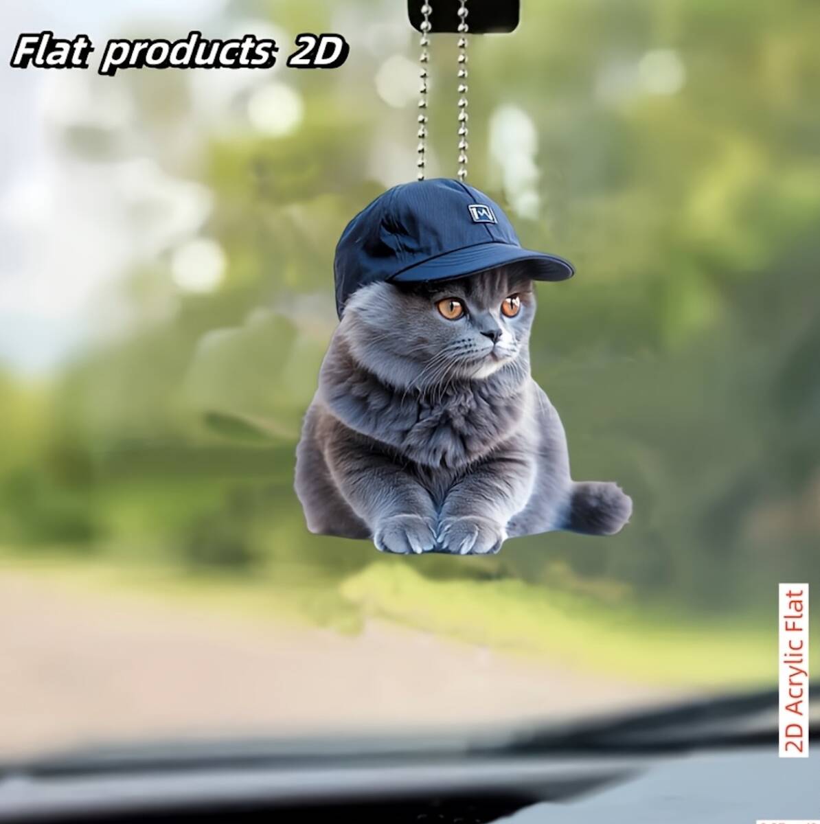 > キーホルダー 帽子を被った猫 アニマル アクリル 大きめ 8cm 車内アクセサリー 平面 2D かわいい ネコ グレー ねこ 動物 インテリア t6672