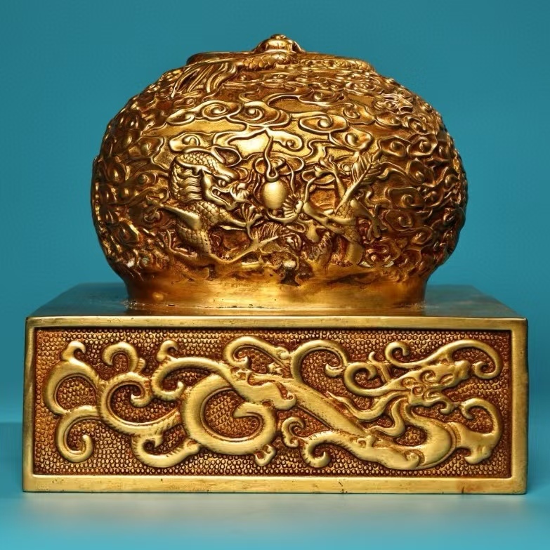 - 印鑑 清代 秘蔵 金九龍帝王印玉璽 皇室の国王の玉璽 文臣武将印鑑 印鑑の方 文房具 古印材 銅製 銅琉金 唐物 收蔵品 時代物 古置物 希少