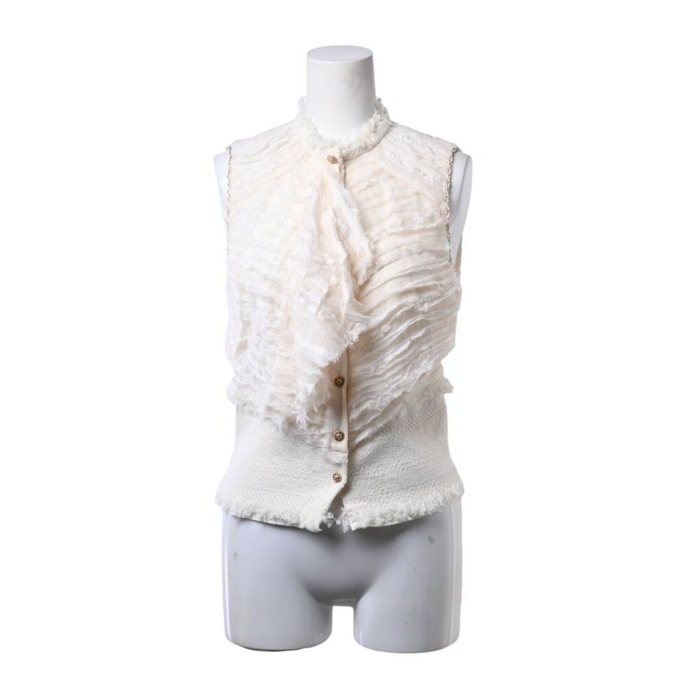 > 美品 CHANEL 08P P32985 ツイード切替 シルク チェーン フリルベスト ラインストーンボタン7個付き KL4BSASA79