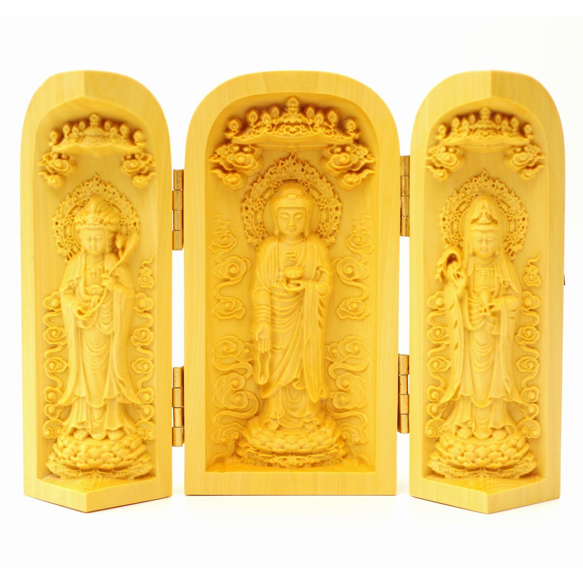 - 【新品】 阿弥陀三尊立像 天然木製(柘植ツゲ) 約10cm 阿弥陀如来 観音菩薩 勢至菩薩 木彫仏像 彫刻 三開仏 2