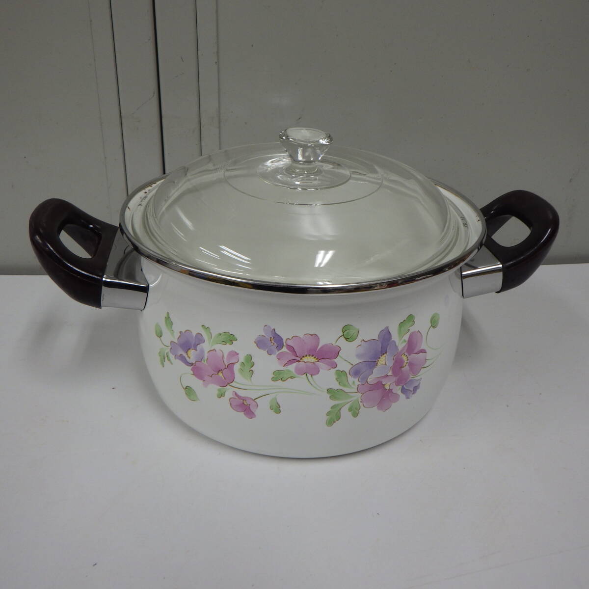 - 昭和 レトロ 花柄 両手鍋 ガラス蓋 ホーロー 琺瑯 鍋