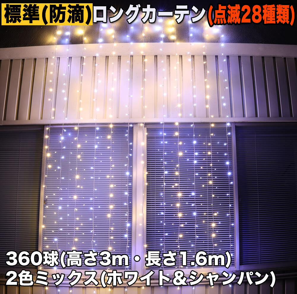 - クリスマス イルミネーション 防滴 ロング カーテン ライト led 高さ3m 長さ8m 1800球 2色 白・シャンパン 28種類点滅 Bコントローラセット