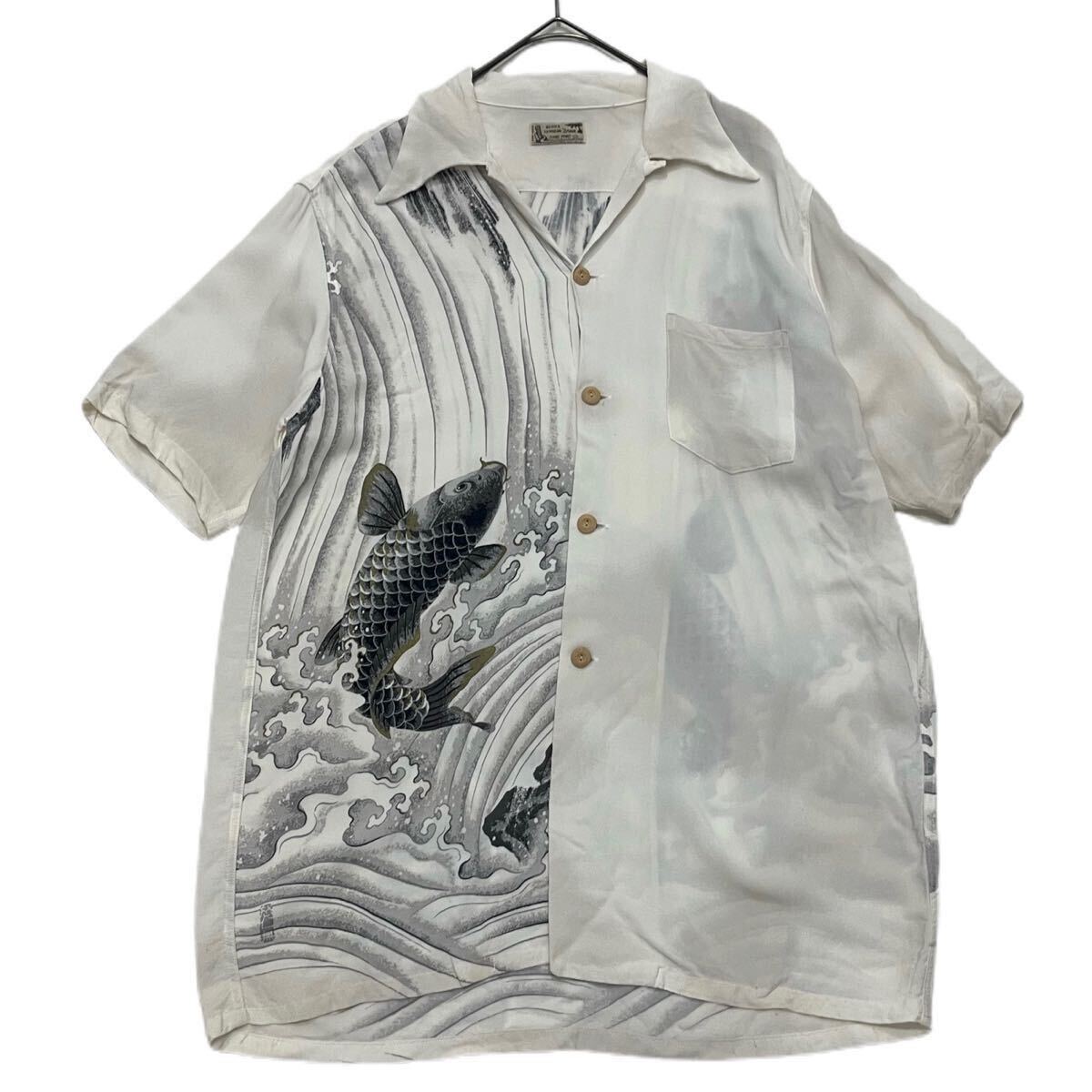 - 【 DENIME 】 美品 ORIZZONTI 鯉 波 両面 和 柄 アロハ シャツ オープンカラー レーヨン M 半袖 魚 ドゥニーム オリゾンティ