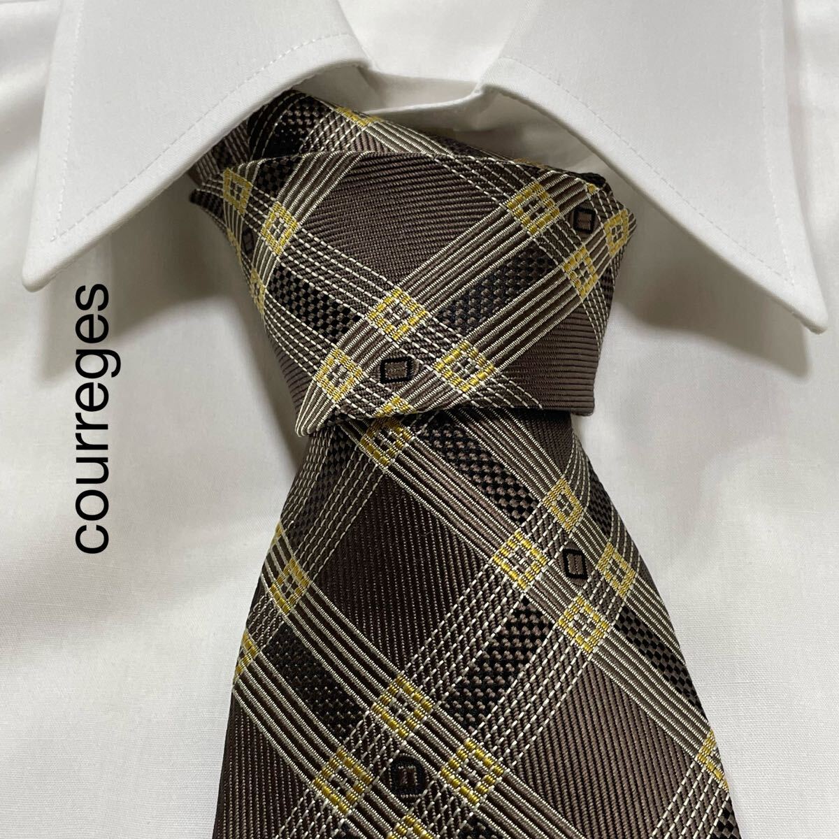 - courreges クレージュ チェック ジャガード デザイン シルク ネクタイ ブラウン イエロー ホワイト TG1634