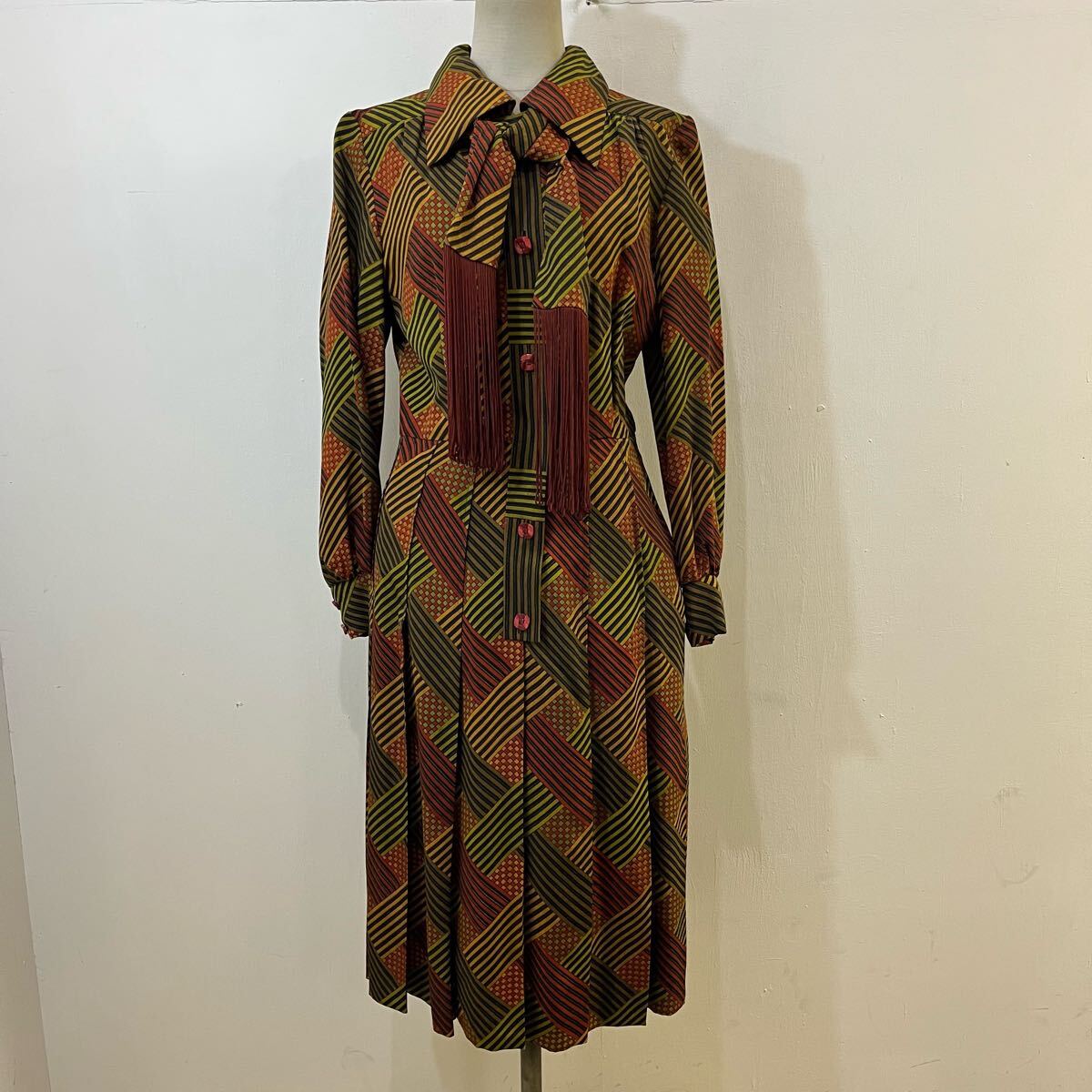 > VINTAGE プリーツワンピース ロングワンピース 総柄 フレアワンピース ウエストベルト フリンジ シャツワンピース【送料一律/同梱可能】G