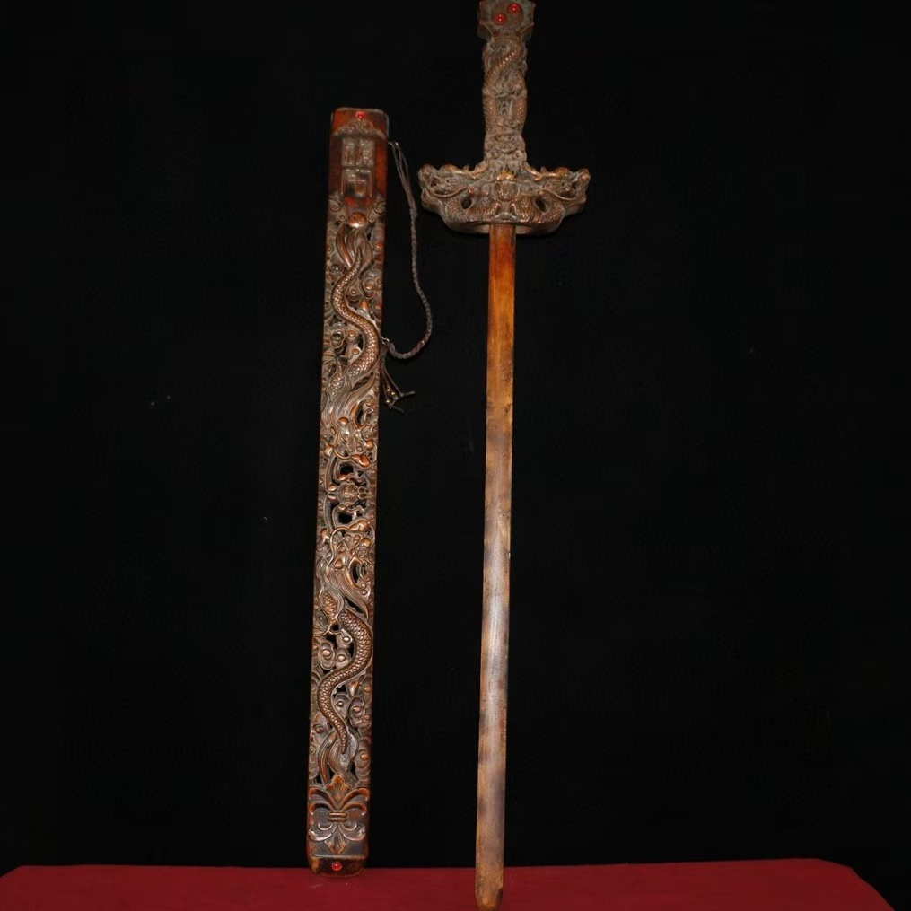 > 古木彫り 秘藏 清代 老桃木【双龍戯珠】龍頭宝剣桃 鎮家魔除けストラップ 書道具 時代物 中国古美術 細密彫 置物 賞物 唐物 木彫り 文玩6.5