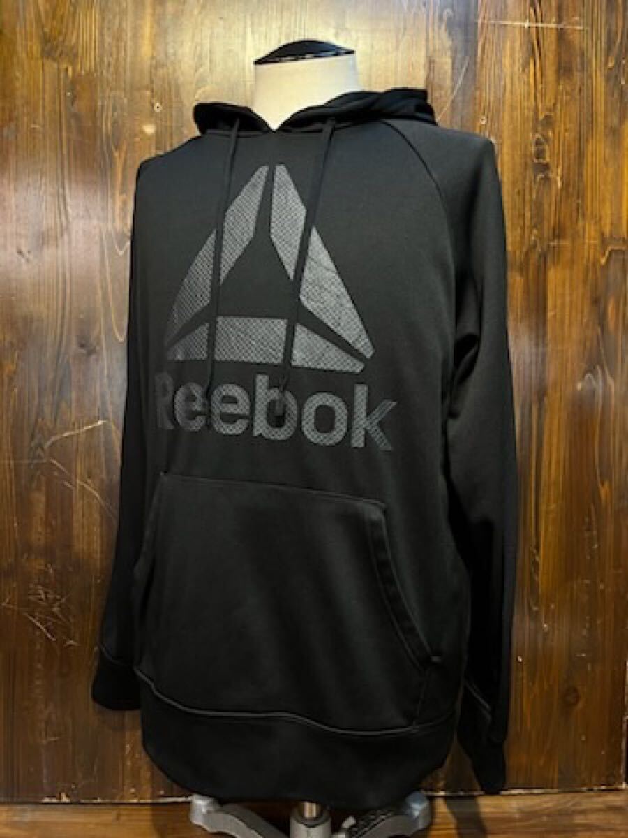 > L448 メンズ パーカー Reebok リーボック ブラック ジャージ ロゴ プリント プルオーバー フーディー スポーツ カジュアル 古着 / 約L (8)