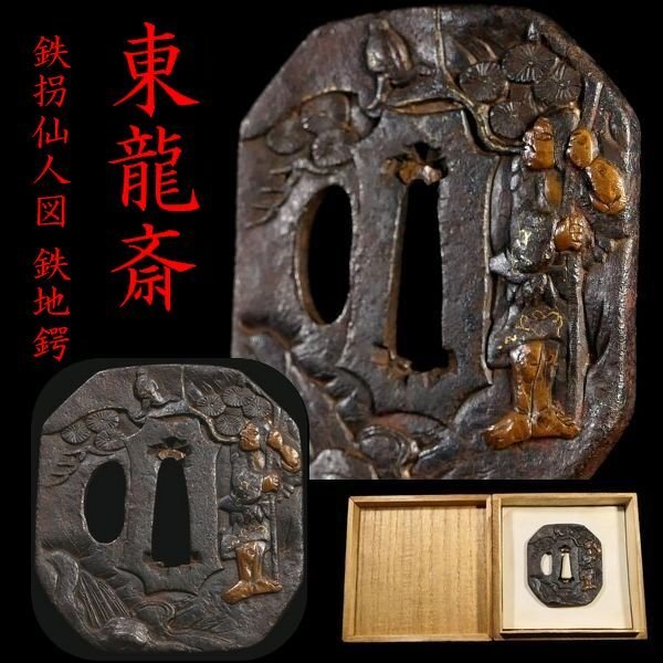 > 【 恵 k0047 】 東龍斎を彷彿とさせる上級作品 「鉄拐仙人図」 八角形 鉄地鍔 高彫細工 象嵌色絵 鉄味良き一品です 桐箱付