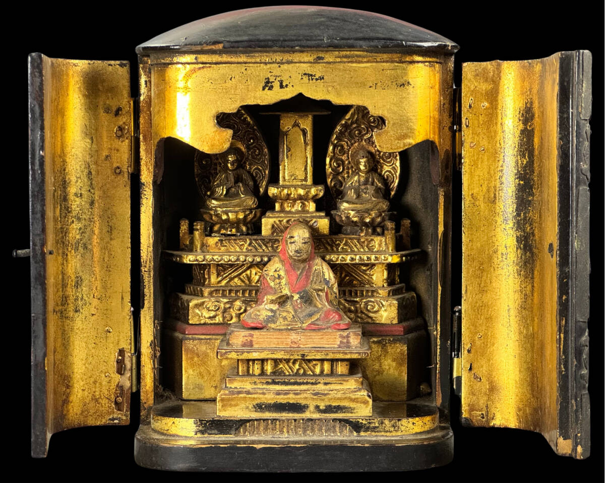 - 【偲】三宝尊に日蓮聖人 木彫 金彩 厨子入仏 仏教美術 高さ約19㌢ 仏像 置物 観音菩薩 インテリア r-613
