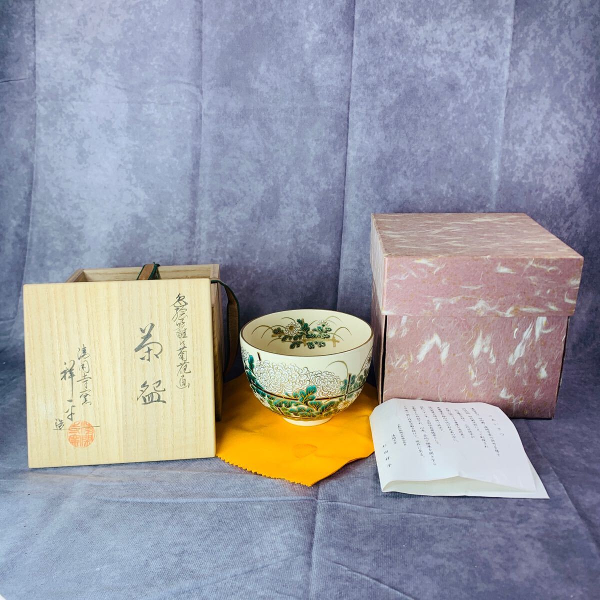 - 清閑寺窯 四代杉田祥平造 色絵籬に菊花画茶碗 茶道具 保証品 紙箱 友箱 茶碗 京焼 共布 木箱入り 茶器 抹茶碗