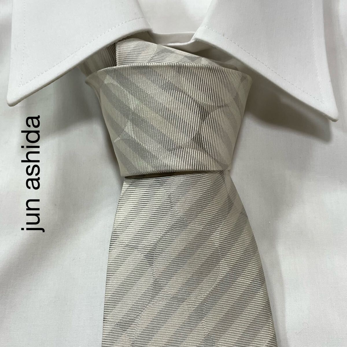 - jun ashida ジュンアシダ 水玉 ストライプ シルク ネクタイ ベージュ グレー PD1959