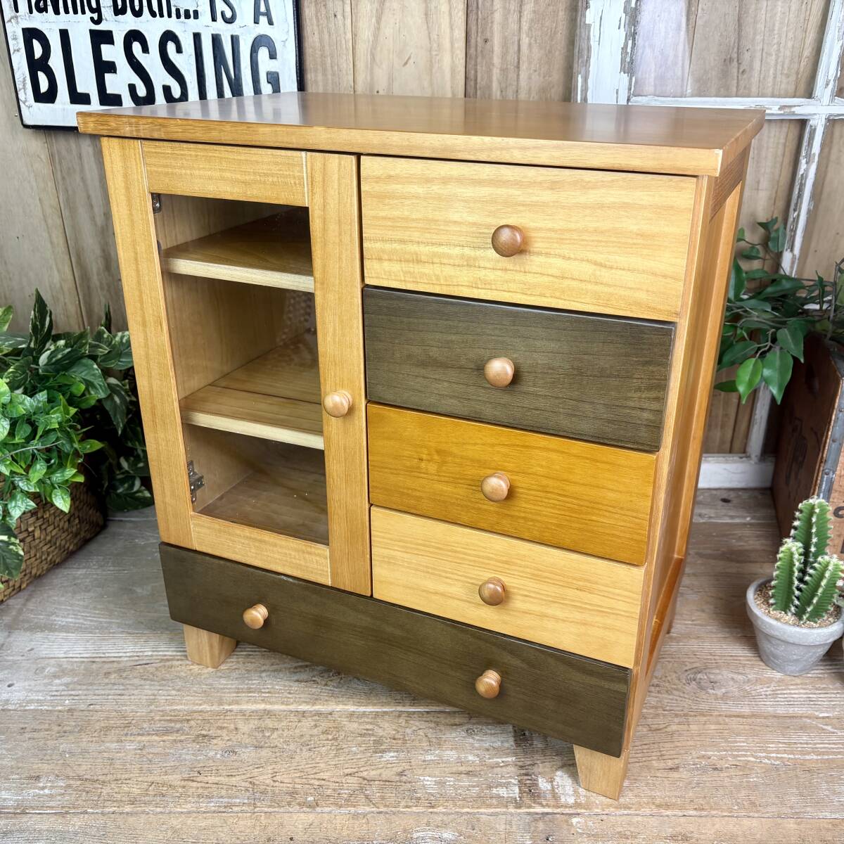 - 送料無料、ナチュラルウッド木製、カラー多引出しガラスキャビネット、洋タンス、小物収納、飾り棚、桐材、アジアン、北欧、カントリー