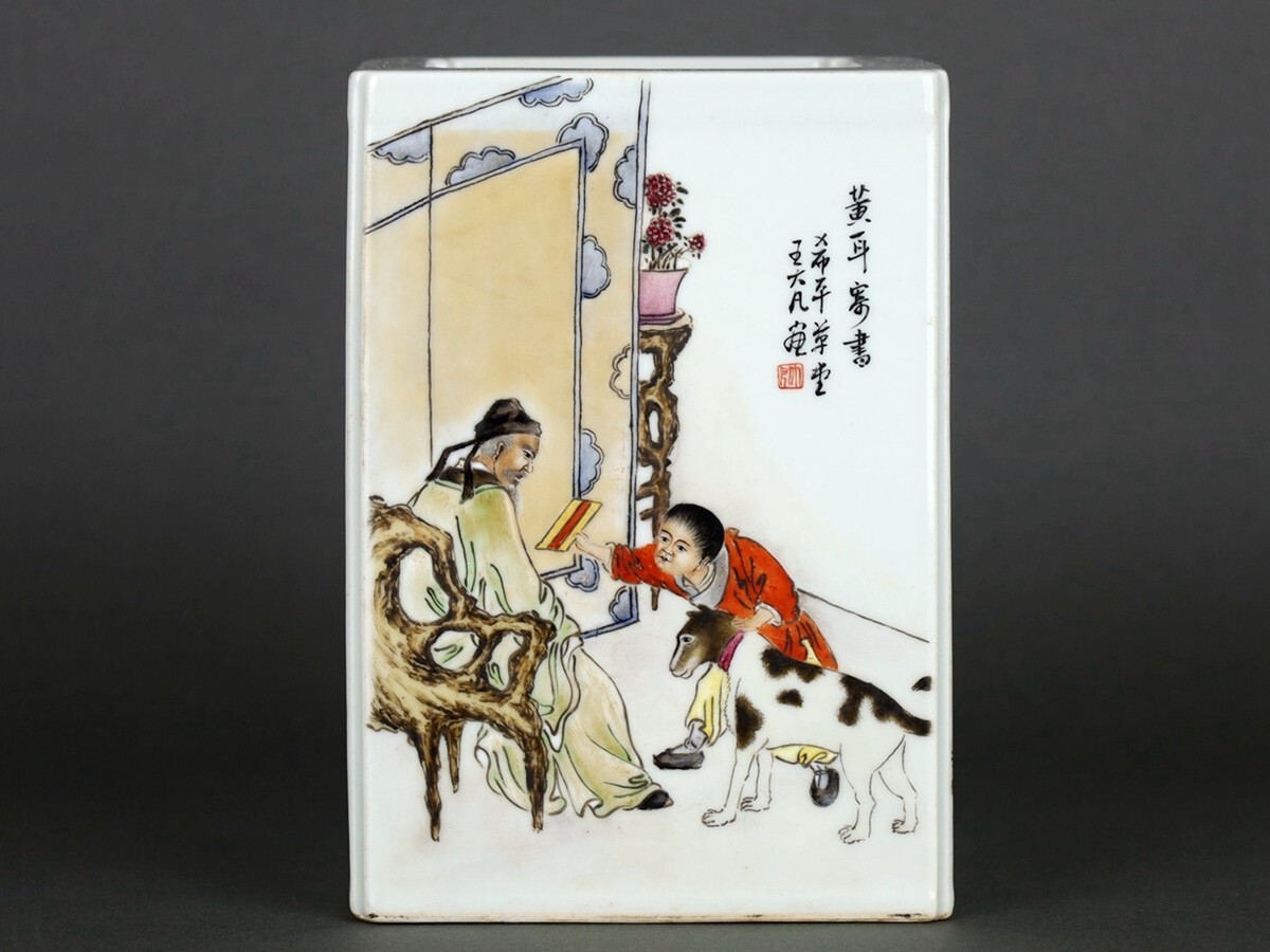 - 「民國時期 王大凡 陶磁器 粉彩人物図 四方筆筒」染付 置物 擺件 古賞物 中国古美術 旧蔵出