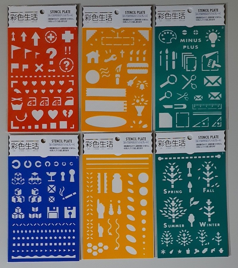 - 5802 未使用、未開封 彩色生活 STENCIL PLATE 6種まとめて はってはがせるステンシルプレート サクラクレパス