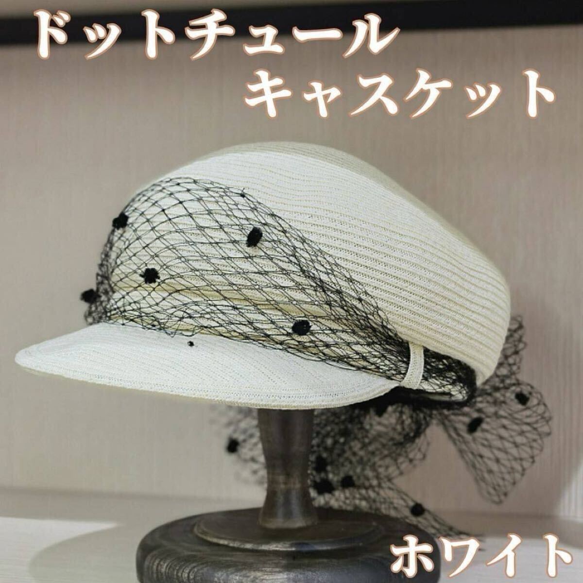 - 新品!ドット チュール キャスケット ホワイト 帽子 ストローハット 上品
