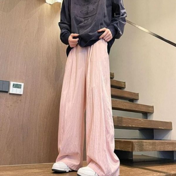 - 春 夏 秋 推薦 /レディース ワイドパンツ 大きいサイズ ウエストゴム 無地 シンプル しわ加工 長ズボン 薄手 長パンツ / ピンク