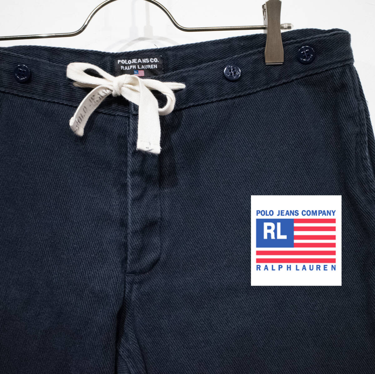 > w80cm / POLO JEANS COMPANY ラルフローレン マリン セーラー ミリタリー パンツ 紐 ステンシル イカリボタン ダークネイビー 古着