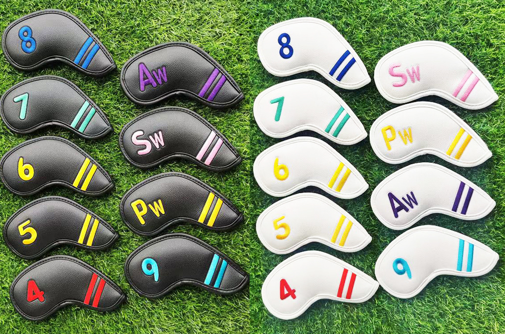- ゴルフヘッドカバー アイアンカバー 番手付 9点セット 9色ライン 4〜9 Pw Aw Sw