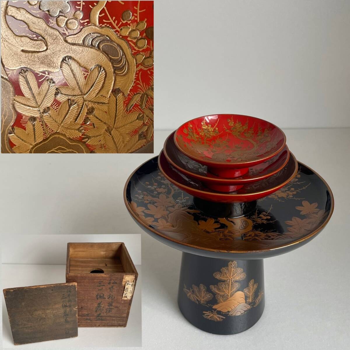 - 【和美】時代 蒔絵 三連 盃 盃台 木箱付 酒器