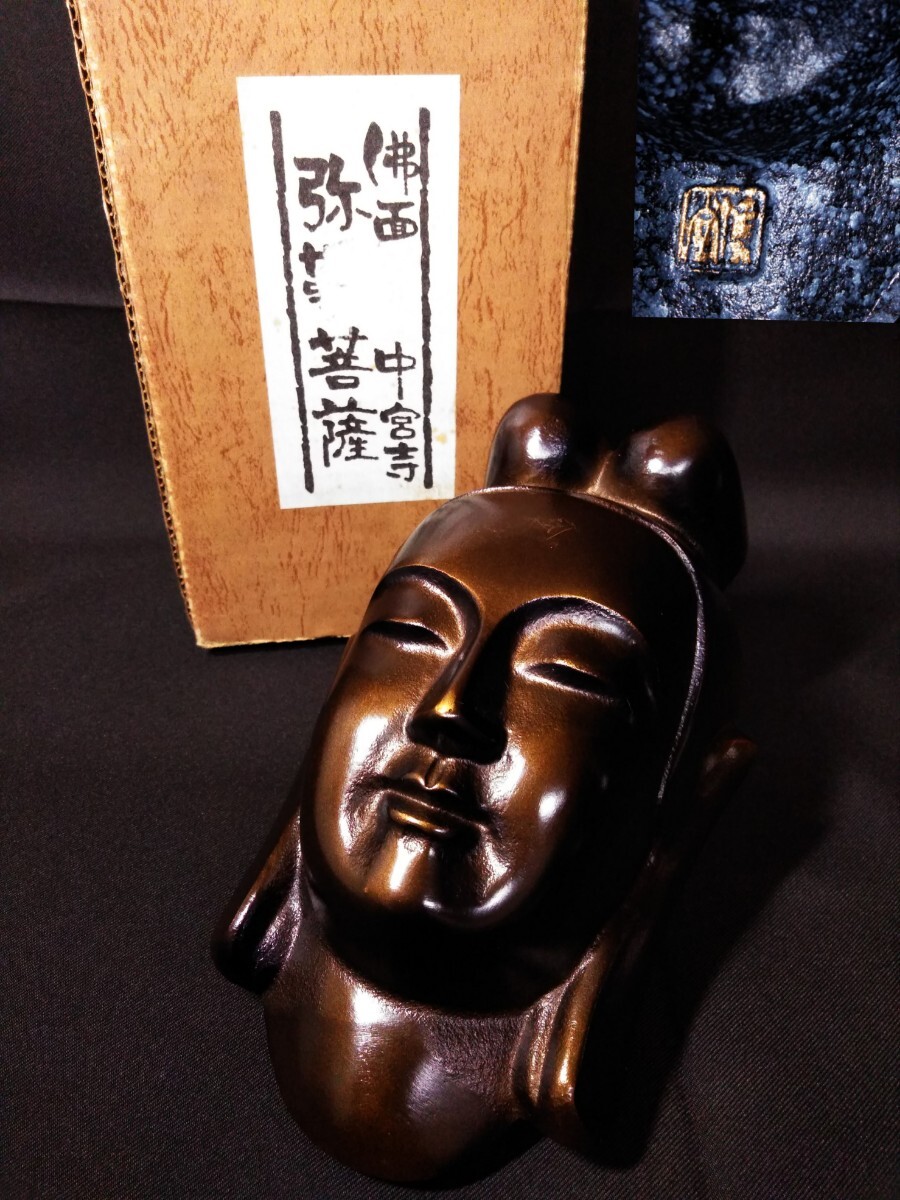 - 弥勒菩薩 仏面 金属製 在印 中宮寺 置物 縁起物 インテリア (検索) 面 金属工芸 美術 仏教 神 インド 吉祥 アンティーク 鋳物 彫刻