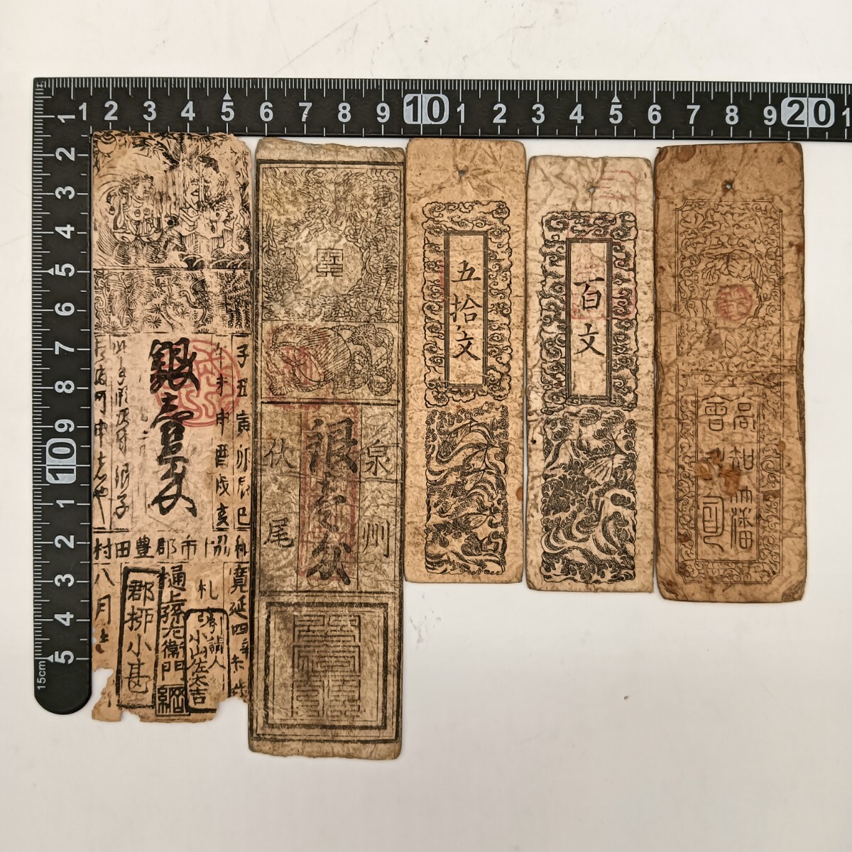 - 【A3467】江戸〜明治時代 古札 藩札 私札 朱印 貨幣 古紙幣 古文書 骨董品 アンティーク 5枚まとめ
