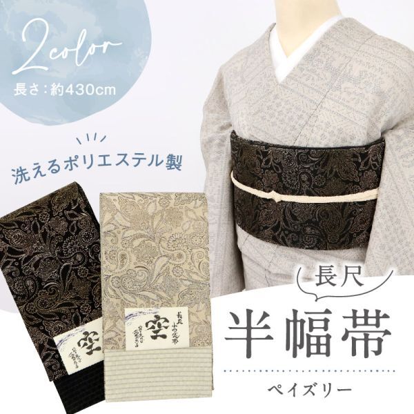 - 【半幅帯】 空 ペイズリー柄 『ブラック』 長尺 リバーシブル 小袋帯 おしゃれ 半巾帯 ポリエステル 長さ430cm 日本製 K25-45