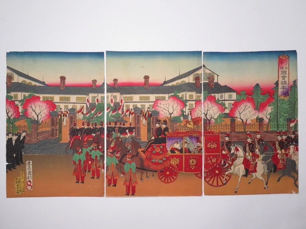 - 【10550】江戸~明治 木版画/浮世絵 国会議事堂図 3枚綴り(初品・買取品)