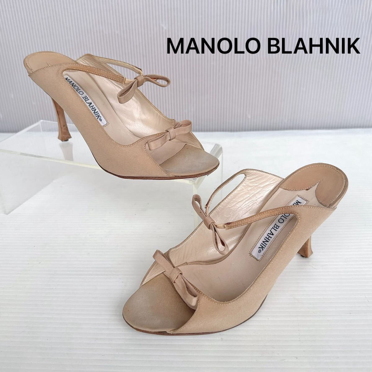 - MANOLO BLAHNIK マノロブラニク リボン オープントゥ サンダル ハイヒール パンプス ミュール 34 シューズ 靴 レーディス ベージュ系