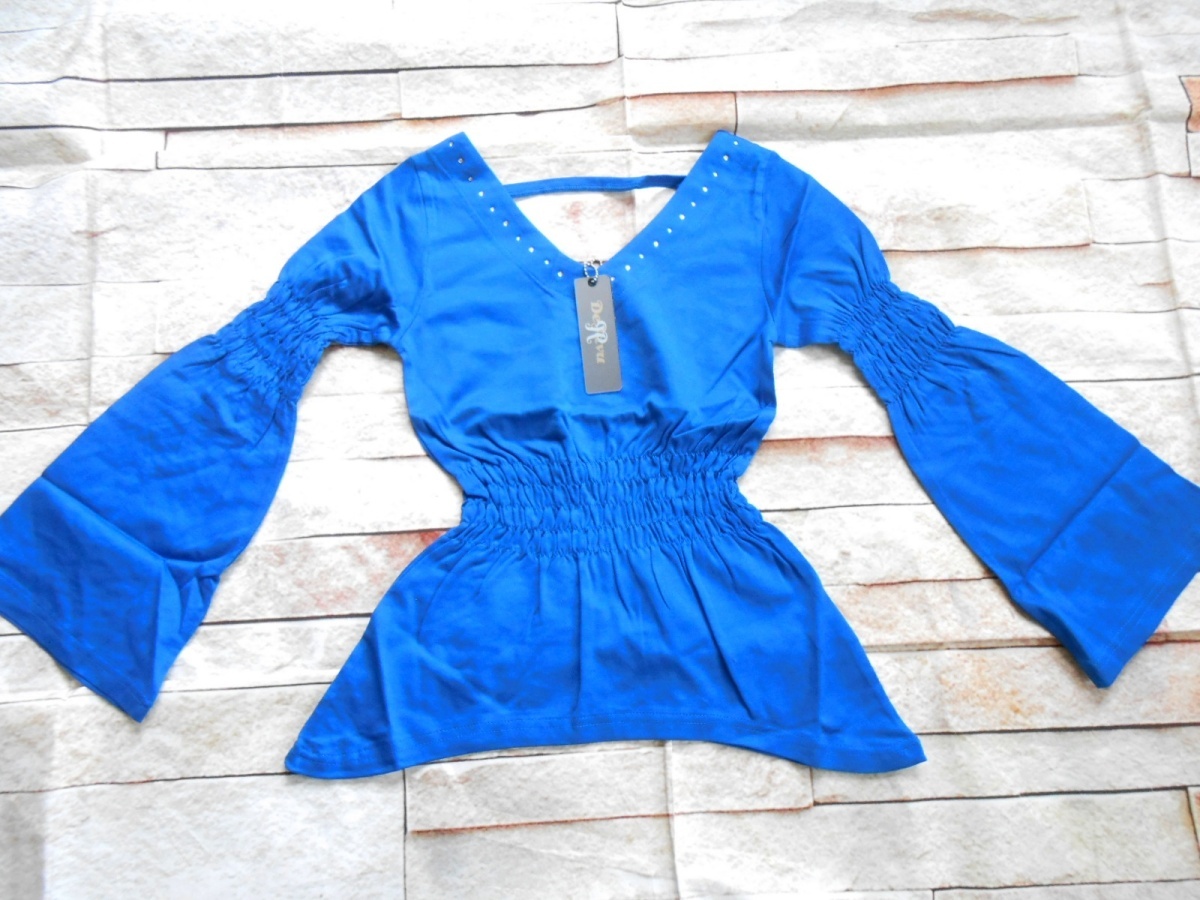 - LE16★DeJave/デジャヴ【Sサイズ】フレア袖のカットソー 深めのVネック 社交ダンス 青 新品未使用