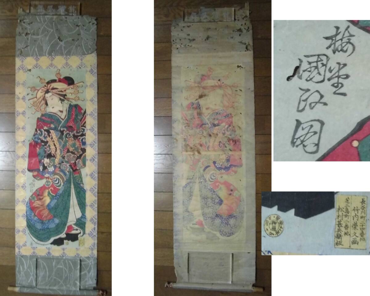 - 古い 掛軸 木版画 浮世絵 縦二枚続 梅堂国政 四代歌川国政 役者絵 美人画 日本画 大判 美術品 時代物 レトロ