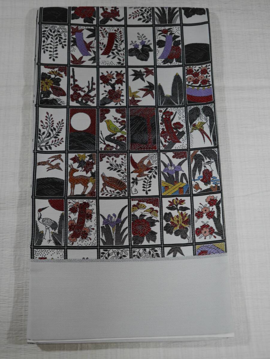 - 未仕立て新品 西陣織最高級袋帯 大光(株) 花かるた 白グレー地色 六通総柄 表地正絹100% お仕立て代込み 送料無料