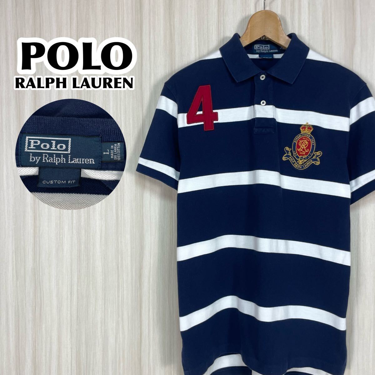 > ☆希少☆POLO ポロバイラルフローレン 半袖ラガーシャツ L 太ボーダー 刺繍ロゴ ゼッケン ロングテール ネイビー×ホワイト 90s 古着