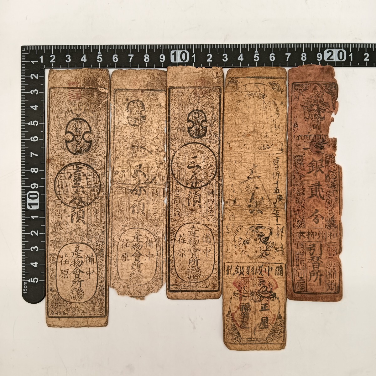 - 【A3518】江戸〜明治時代 古札 藩札 私札 備中 朱印 貨幣 古紙幣 古文書 骨董品 アンティーク 5枚まとめ