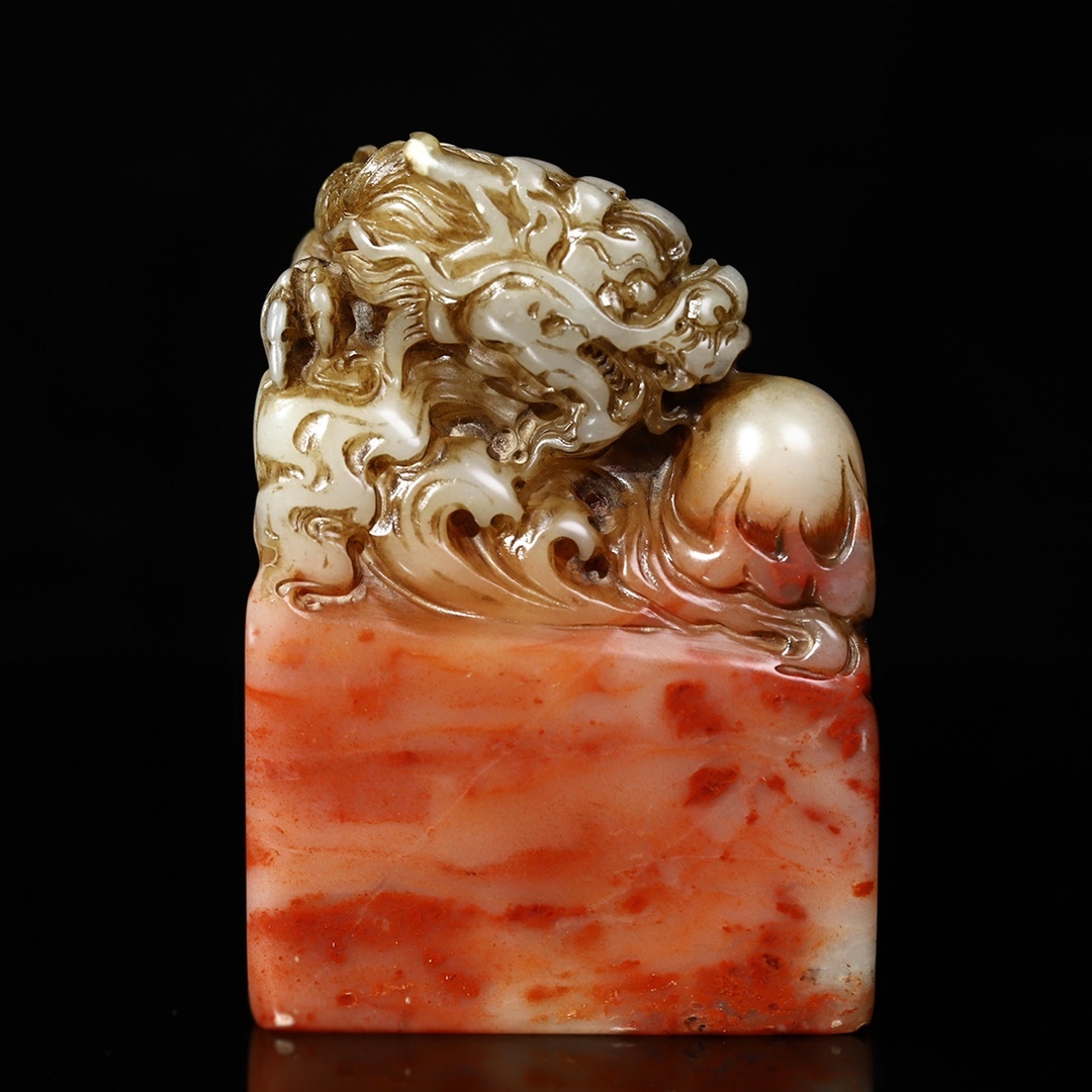 - 旧蔵 清 寿山芙蓉石 彫刻 騰龍戲珠 龍鈕印鑑 天然石 手彫 篆刻 古印材 極細工 中国古玩 骨董品 古美味 206-23