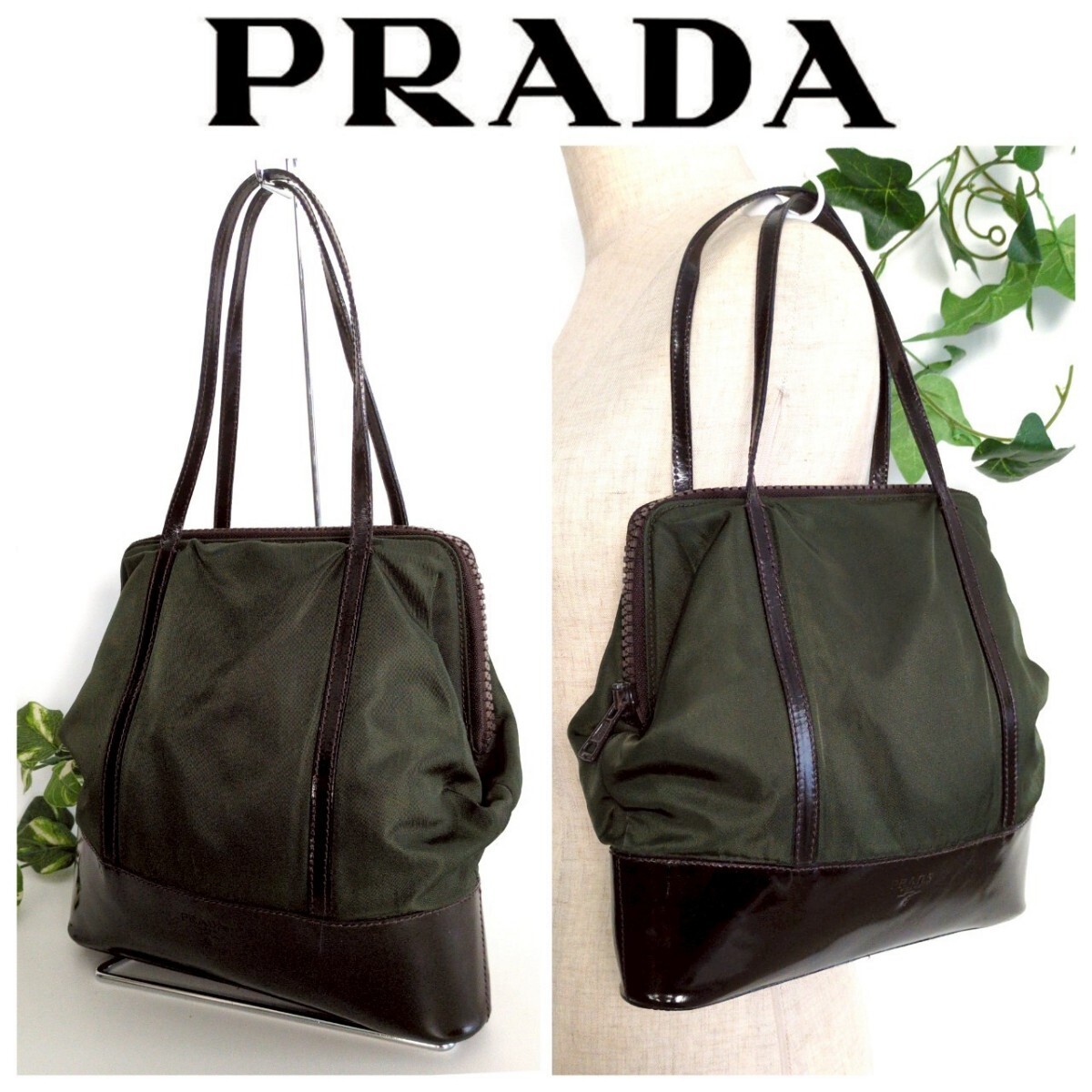- 美品 プラダ アーカイブ 96s がま口型 ラウンドファスナー ナイロン レザー 軽量 バッグ 鞄 オリーブ ヴィンテージ OLD レディース メンズ