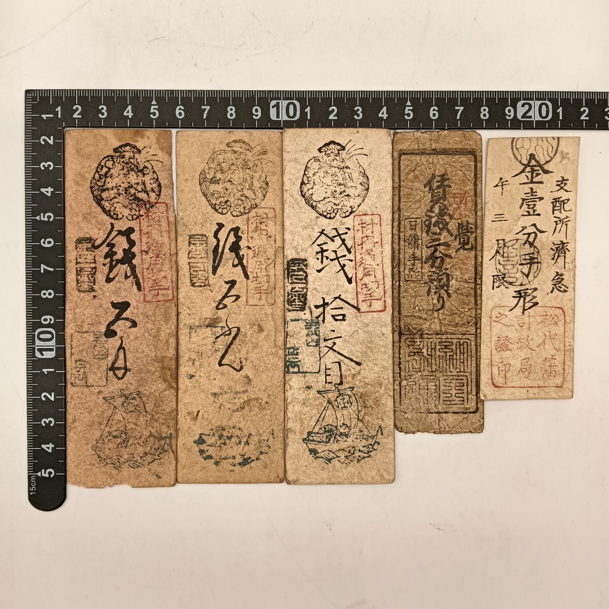 - 【A3547】江戸〜明治時代 古札 藩札 私札 朱印 貨幣 古紙幣 古文書 骨董品 アンティーク 5枚まとめ