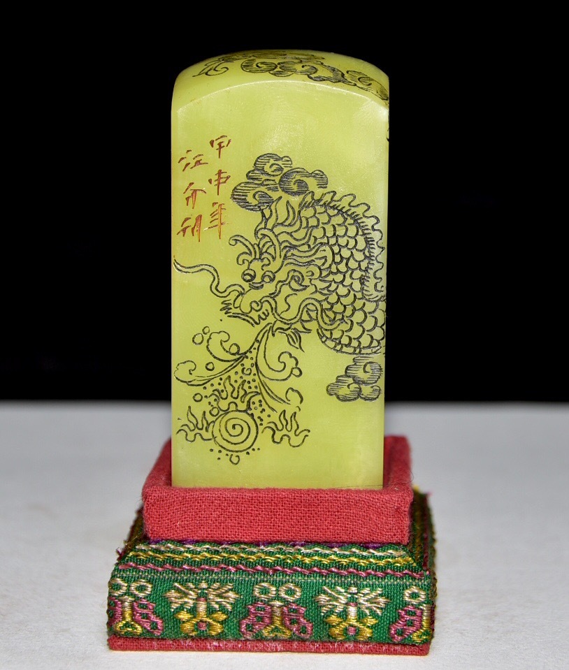 - 蔵友旧蔵出 寿山石 艾葉綠 細密彫 神龍吐水紋 印章 箱付 貴重品 稀少物品 置物 賞物 中国時代美術品
