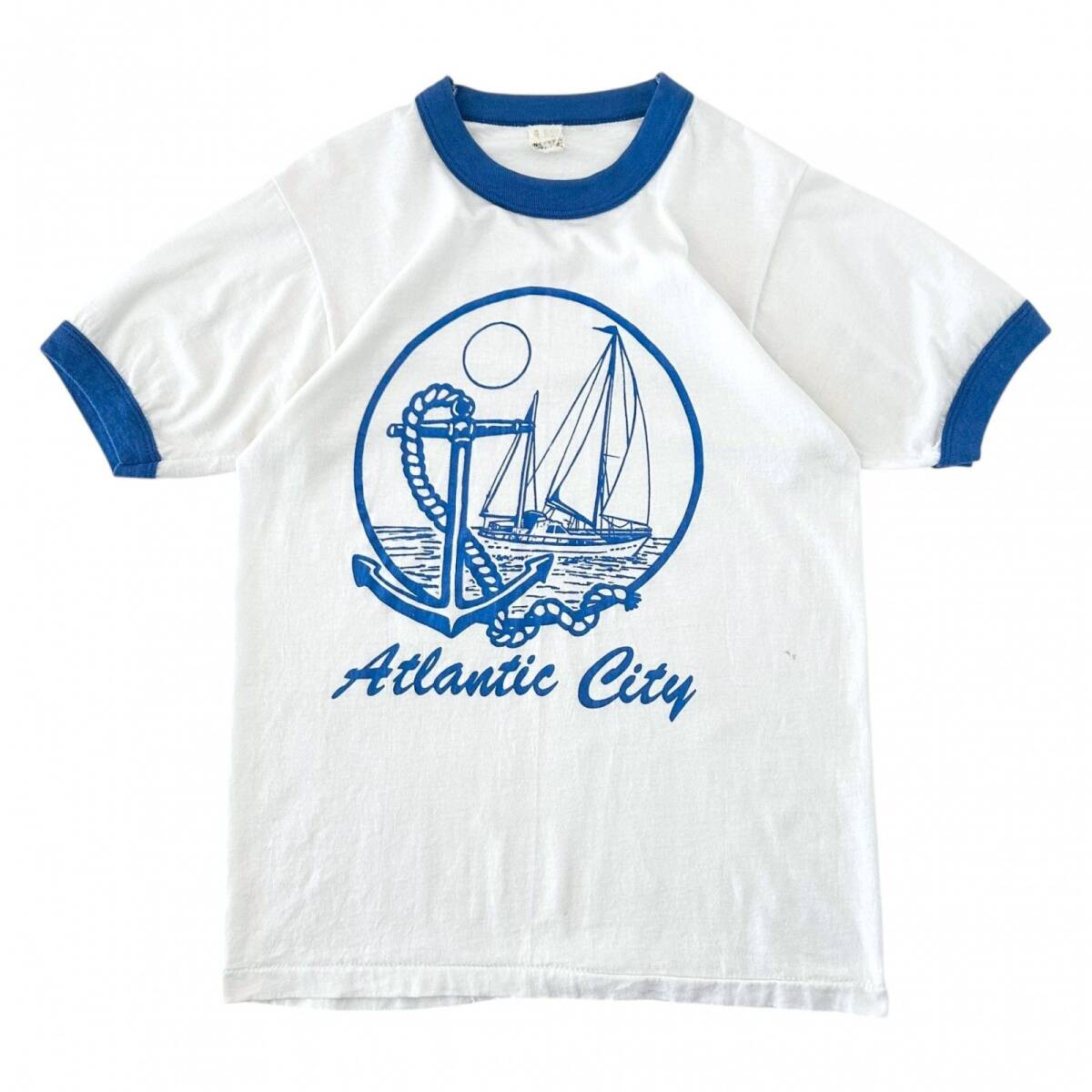 > S 80s USA製 スクリーンスターズ ヴィンテージ リンガーTシャツ 船 ヨット 海 碇 シングルステッチ コットンポリ ロゴ ホワイト ブルー