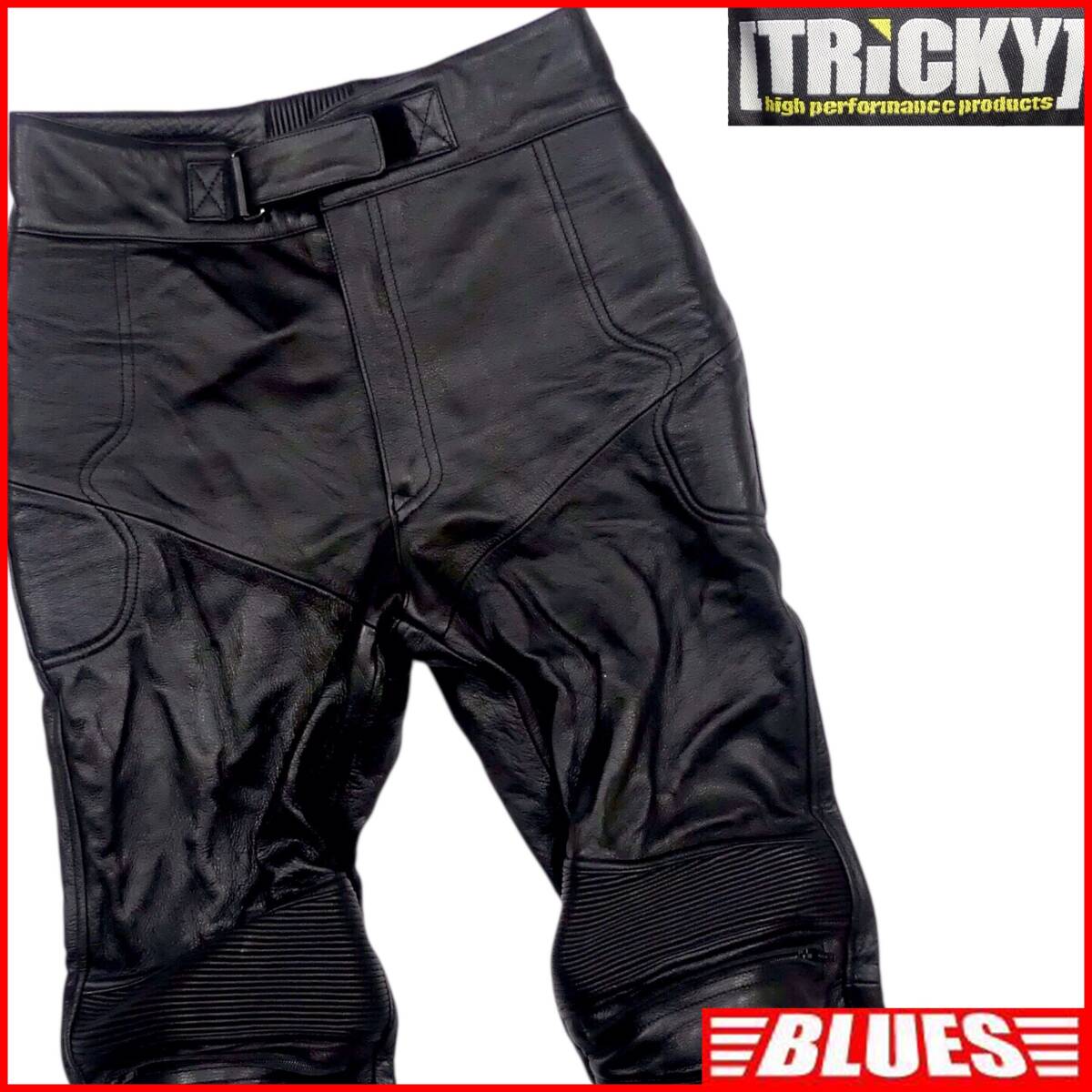 > 即決★TRICKY★メンズ XL レザーライディングパンツ トリッキー 黒 本革 ライダースパンツ 皮 ヒザパッド 裾ジップ ツーリング レーシング