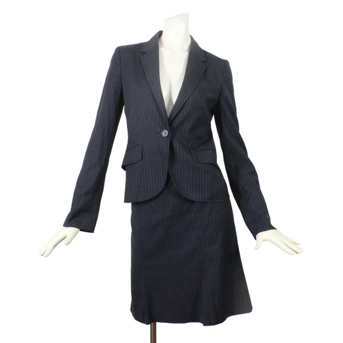 > 25【美品】アンタイトル スカートスーツ 2 ブラック 黒 ストライプ M ストレッチ 面接 ビジネス tqe UNTITLED 春夏秋 ★美品★