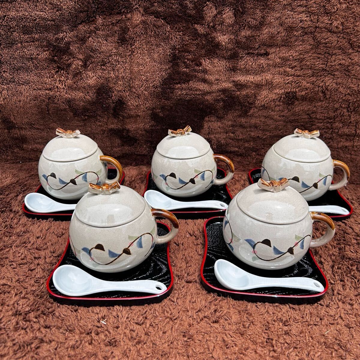 - 茶碗蒸しセット 食器 陶器 小盆 スプーン付き 蓋付き 5客 未使用 美品 和食 料亭 居酒屋 昭和レトロ