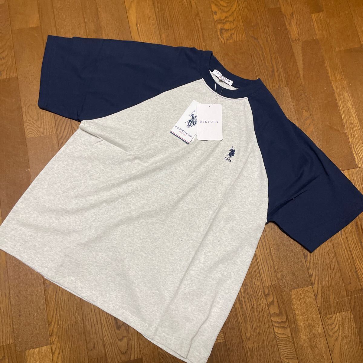 > 新品・未使用♪♪U.S. POLO ASSN♪ワンポイント刺繍 ラグラン配色オーバーサイズ半袖Tシャツ ♪Lサイズ♪ネイビー&オートミール♪