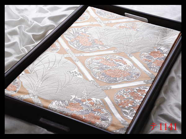 - 蔵【テ1141】西陣逸品 格天井草花紋 淡香色地 気品豊かに 正絹純金糸六通高級美術袋帯 ◇検◇簪着物名古屋帯和装小物帯締め